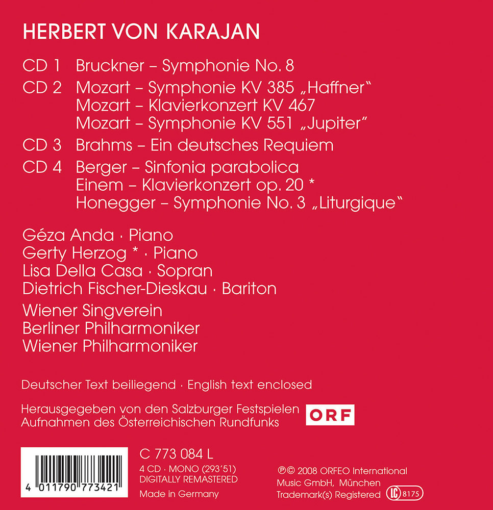 1957 was Herbert von Karajan’s first year as artistic director of the Salzburg Festival, and he was determined to leave the world in no doubt about his versatility as a conductor. Four orchestral concerts featured not only core works from the symphonic repertory but also music with which his name is nowadays only rarely associated. Above all, however, he imported the Berlin Philharmonic and divided the concerts between them and the Vienna Philharmonic, a body of players that had previously had no rivals in Salzburg. At the 1957 Festival’s opening concert, it was Vienna’s leading orchestra which, in keeping with tradition, performed Bruckner’s Eighth Symphony in a reading that was arguably more „earthy“ and less otherworldly than other performances under Karajan. In particular, the tone colours of the strings and winds, applied with particular assurance and power, enabled the conductor to achieve a sense of the greatest solemnity entirely commensurate with the occasion. The following day the Berlin Philharmonic and their principal conductor brought to an all-Mozart programme the virtuosic and lively interpretative style that orchestra and conductor shared. The programme on this occasion included the „Haffner“ and „Jupiter“ Symphonies and the C major Piano Concerto K 467 with Géza Anda as the soloist. For their second concert with Karajan, the Berliners returned to the Mozarteum – a venue that is nowadays hard to imagine as the setting for such an occasion – for a programme made up entirely of contemporary works, namely, the world première of the Symphonia parabolica by Theodor Berger, a pupil of Franz Schmidt and Erich Wolfgang Korngold, Gottfried von Einem’s Piano Concerto op. 20 and Honegger’s Symphonie liturgique, this last-named work in an interpretation that the conductor had the courage to invest with real emotional weight. Honegger’s symphony is very much a confessional work, allowing Karajan to forge a link between it and the piece that he conducted on 22 August in the Felsenreitschule: Brahms’s German Requiem. Here the Vienna Philharmonic was joined by the Vienna Singverein, a chorus that the conductor was to use in many of the great works of the choral repertory over a period of several decades, and by the two soloists Lisa Della Casa and Dietrich Fischer-Dieskau. The result was a performance whose very special qualities can perhaps be best appreciated only at a distance of half a century.